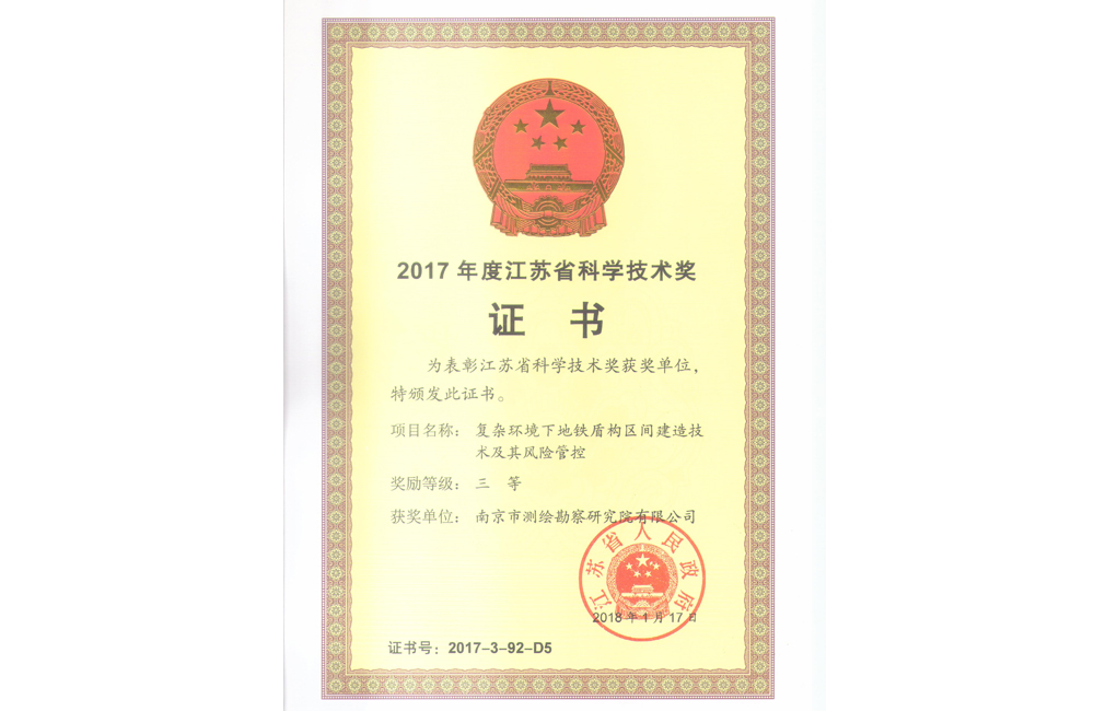 2017年度江蘇省科學(xué)技術(shù)三等獎——復(fù)雜環(huán)境下地鐵盾構(gòu)區(qū)間建造技術(shù)及其風(fēng)險管控