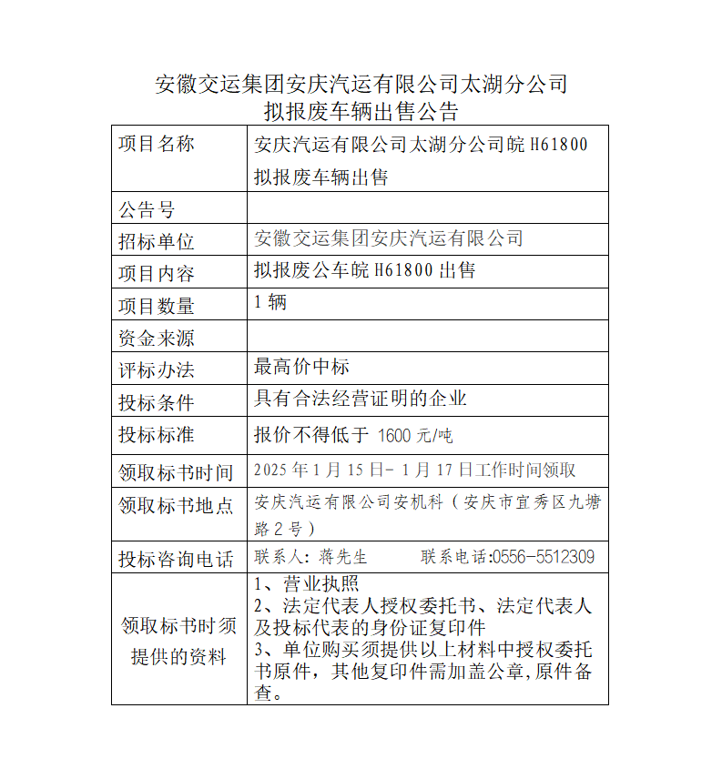 太湖分公司擬報(bào)廢車輛出售公告