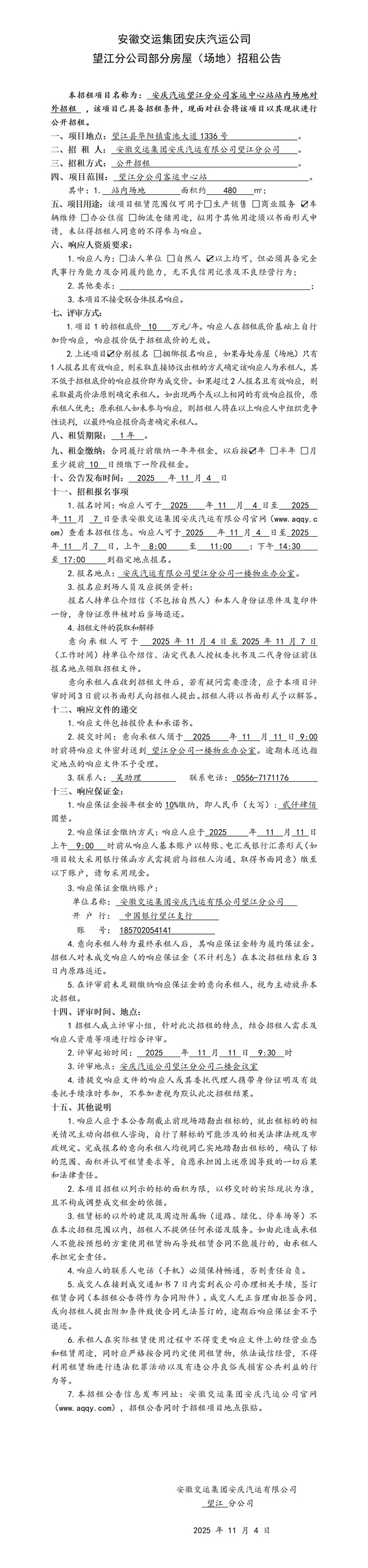 望江分公司部分房屋(場地)招租公告