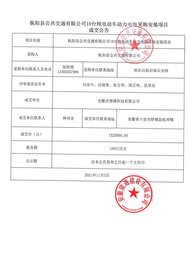 樅陽公共交通有限公司10臺純電動車電池采購安裝項目成交公告