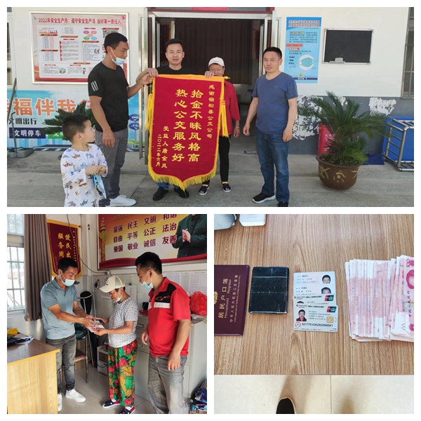 事情是這樣的,2022年6月4日下午,宿松城市5路公交車到終點(diǎn)站,駕駛員黎石保在乘客下車后對(duì)車輛進(jìn)行清潔消毒時(shí),突然發(fā)現(xiàn)車廂座位上有一個(gè)黃色布袋。打開(kāi)一看布袋里有個(gè)黑色皮包,皮包內(nèi)有現(xiàn)金、身份證、社?ǖ。黎石保原地等待一段時(shí)間,失主一直沒(méi)有出現(xiàn)。公交班車回站后,依照公司相關(guān)管理規(guī)定,黎石保第一時(shí)間將布袋上交公司。經(jīng)工作人員清點(diǎn),內(nèi)有現(xiàn)金4700元,2張身份證、2張社?ǎ约耙槐敬婵1.6萬(wàn)的存折。