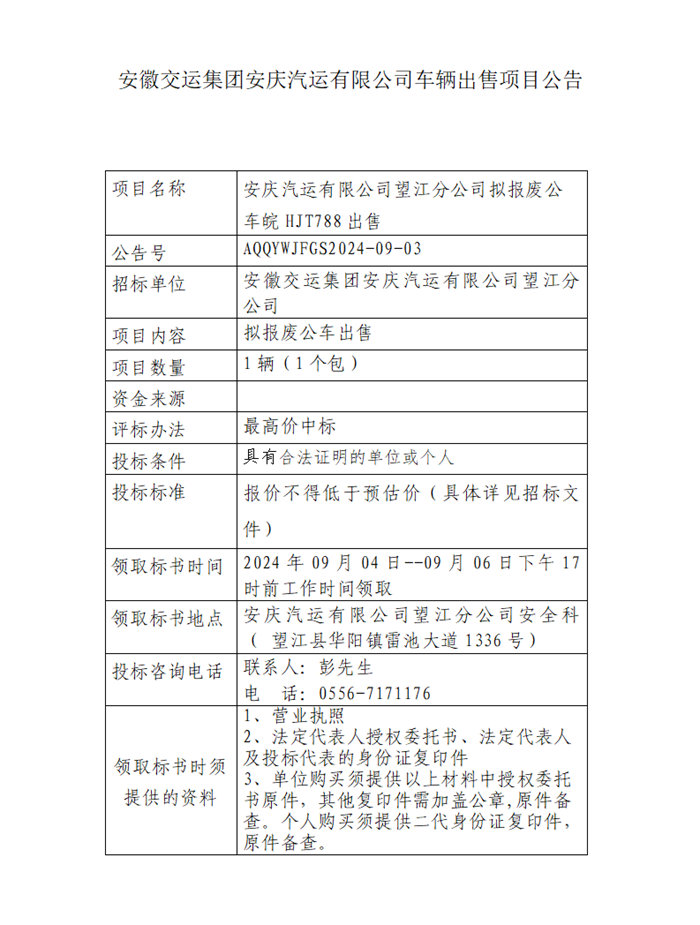 望江分公司擬報廢公車皖HJT788出售項目公告
